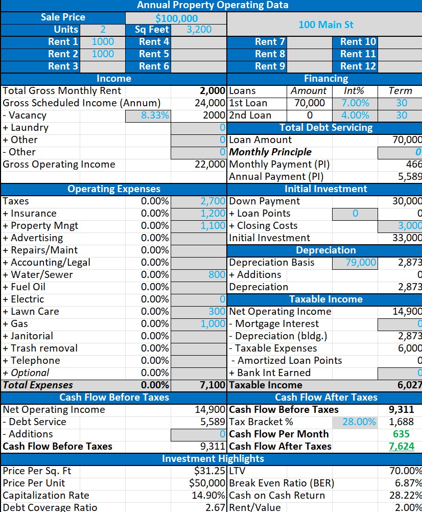 One of the quickest and best products in my real estate tool belt is the Annual Property Operating Data (APOD) template. With this tool at your side, you’ll be able to analyze deals by the dozens in a streamlined, efficient manner. Just enter the variables unique to the property you are analyzing and decide whether the deal is worth pursuing.